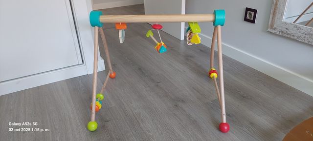 Detalles del productoGimnasio de actividades de madera para bebés, con juguetes colgantes de colores y piezas laterales pata girar y explorar.