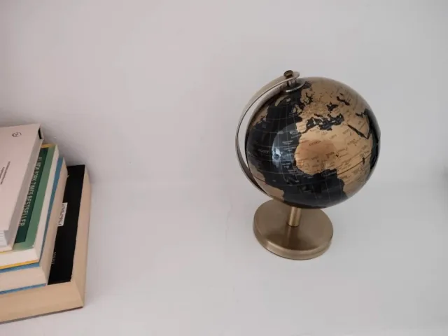 Detalles del productoGlobo terráqueo con base y soporte metálico en acabado dorado. Presenta los continentes y países en tonos dorados sobre un fondo negro.