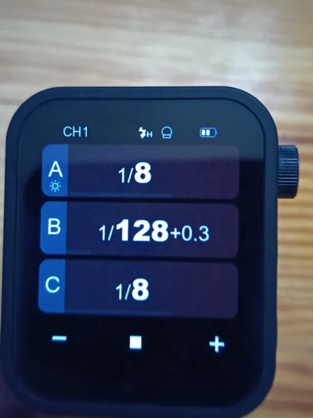 Disparador de flash Godox X3. - Canal CH1. - Ajustes para grupos A, B y C. - Indicador de batería. - Para CANON