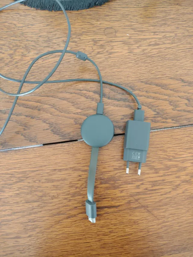 Dispositivo de streaming Chromecast de Google. Permite enviar contenido a tu TV. - Cable de conexión incluido. - Adaptador de corriente.