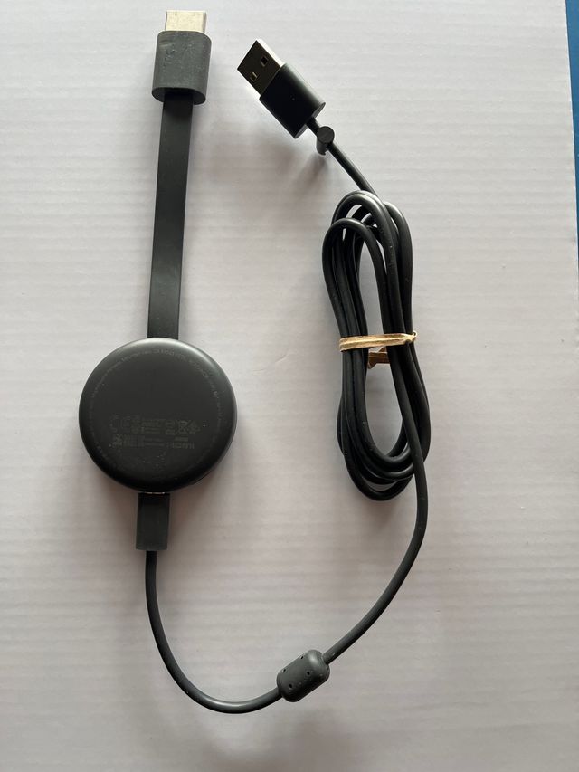 Dispositivo de streaming Google Chromecast. - Diseño circular en color negro. - Incluye cable HDMI y cable de alimentación USB.