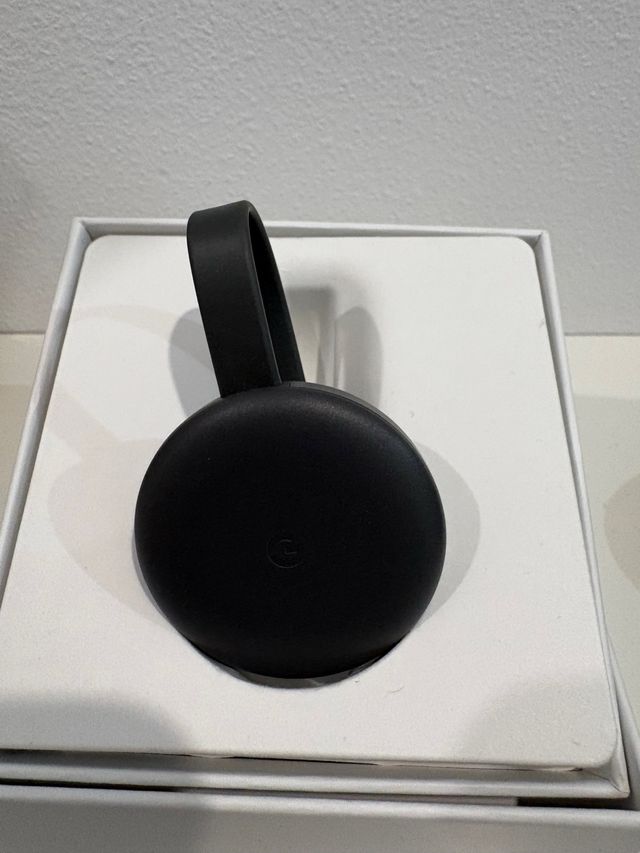 Dispositivo de streaming Google Chromecast en color negro. Su diseño redondo y compacto lo hace ideal para conectar a tu televisor. - Color: Negro. - Forma: Redonda.