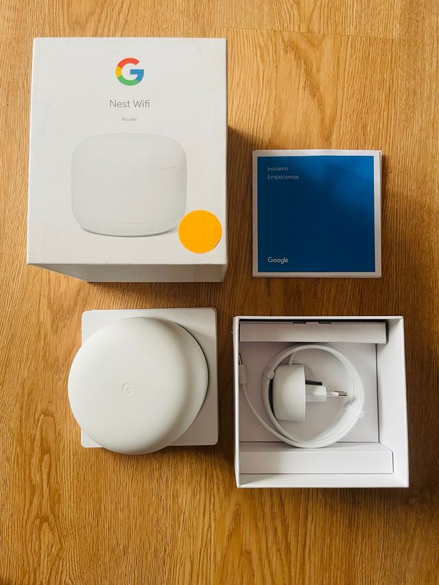 Detalles del productoRouter Google Nest Wifi en color blanco. Incluye el router principal y su cable de alimentación.