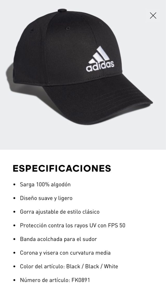Detalles del productoGorra de Baseball, aunque se puede usar para todo, siempre la compro por su factor de proteccion 50, la talla es la mas grande , para diametro 59 , 60, aunque es regulable, esta nueva sin estrenar en su bolsa y con sus etiquetas.