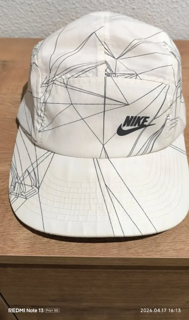Gorra de cinco paneles con un diseño geométrico en blanco y negro.