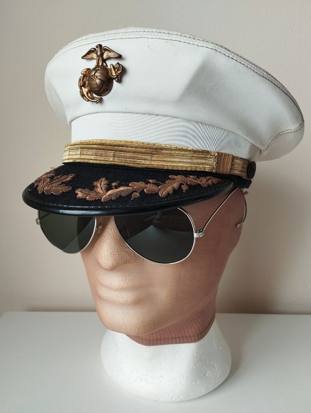 Gorra del Cuerpo de Marines estadounidenses, con corona blanca del traje de gala, insignia frontal identificativa EGA (Eagle, globe and Anchor – Aguila, globo terráqueo y ancla) en metal dorado, carrillera dorada, botones laterales USMC y visera bordada de oficiales.