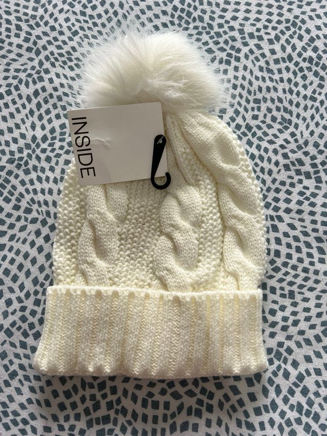 Gorro de lana tejido con un pompón de pelo sintético. Es de la tienda Inside de carrefour de tenerife, esta sin utilizar.