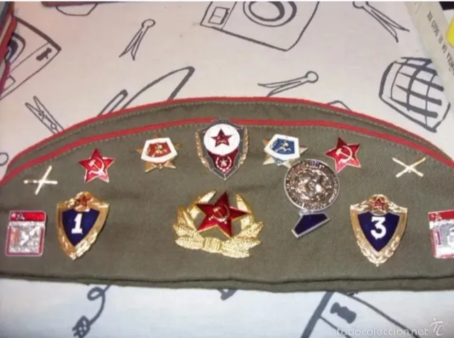 Detalles del productoGorro militar de estilo ruso con varias insignias y condecoraciones.