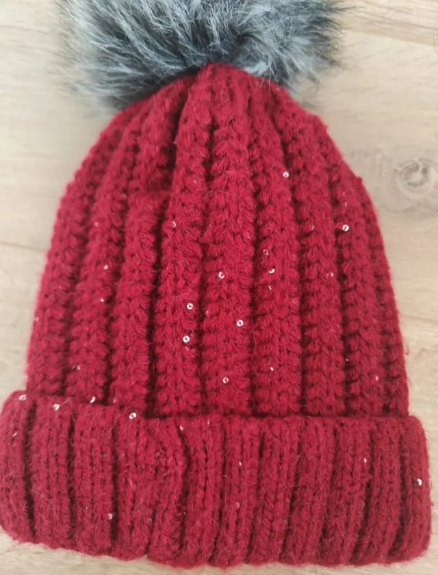 Gorro rojo vino con pompón y lentejuelas