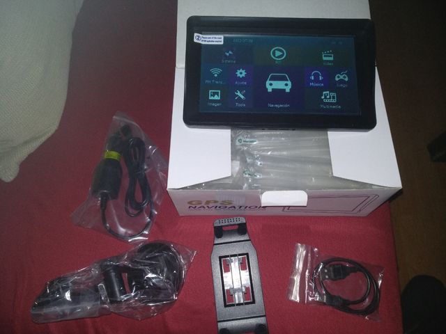 Con cargador coche-camión 12-24V, cable carga, soporte trasero, ventosa, cargador 240V, funda neopreno, caja. Visera parasol incorporada al GPS.