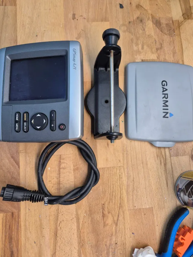 Dispositivo GPS Garmin 421 con accesorios. - Pantalla GPS Garmin. - Cable de conexión. - Soporte para montaje. - Targeta con cartas