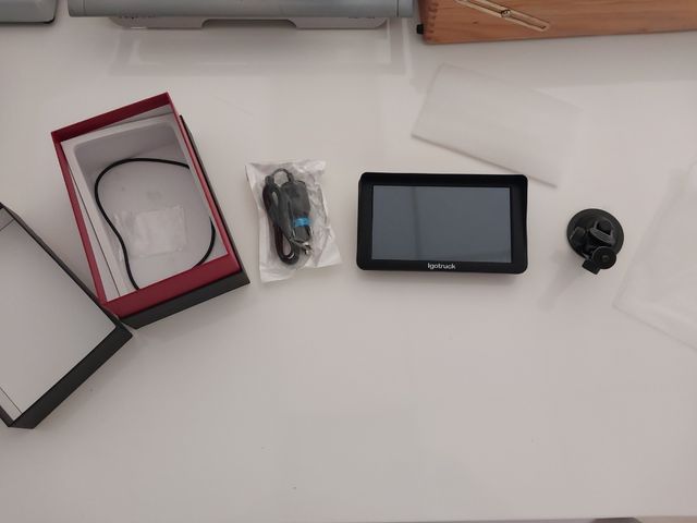 Navegador GPS Igo Truck en perfecto estado. Incluye dispositivo, cargador de coche y ventosa. Dispone de pantalla con protector. Funciona con sistema operativo Android.