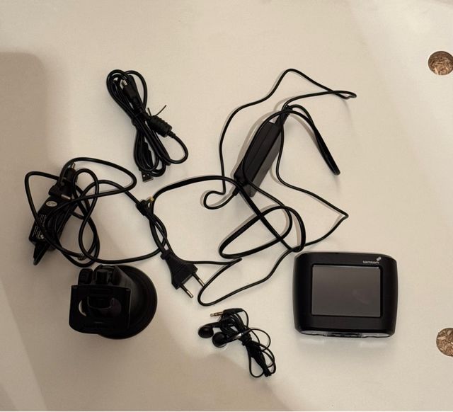 Dispositivo GPS Tomtom diseñado para camiones. Incluye varios accesorios para su uso. - Soporte con ventosa. - Cargador de coche. - Cable USB. - Auriculares.