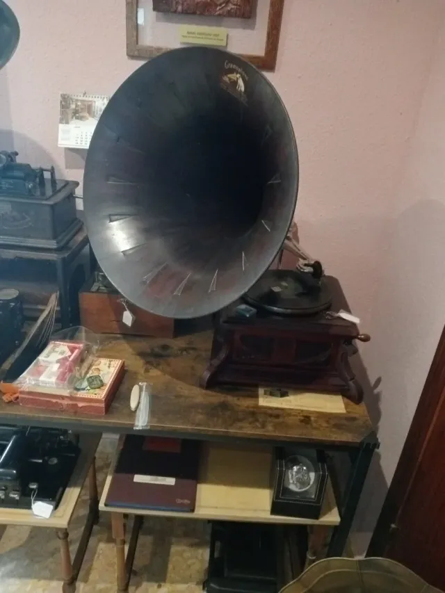 Detalles del productoGramófono antiguo La Voz de su Amo con trombón de madera. Una pieza clásica para coleccionistas.