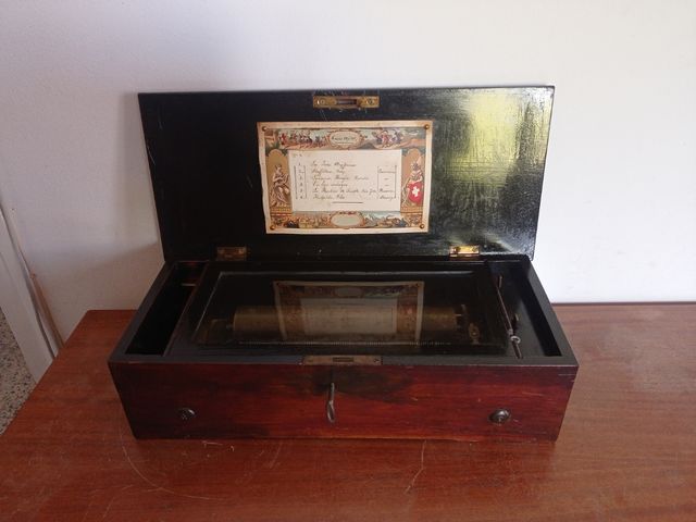 Gramola antigua en buen estado de conservación. Se puede enviar video de su funcionamiento. - Mecanismo de cilindro. - Decoración en la tapa.