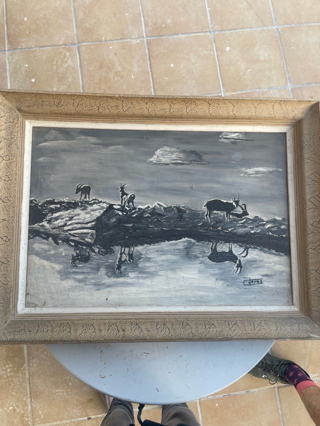 Óleo original firmado Jover con espectacular marco clásico de gran presencia y calidad. Escena de montaña con cabras y reflejos en agua. Pieza elegante, decorativa y lista para colgar. Medidas 65x48 cm