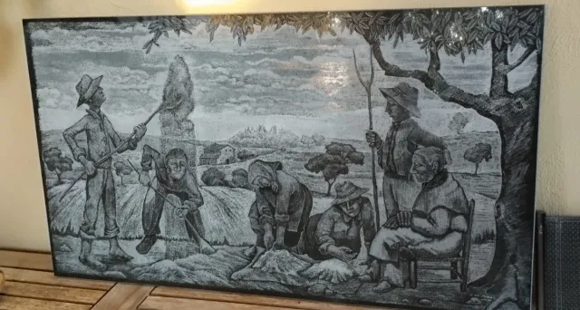 Detalles del productoDetalle en granito de una escena rurall con campesinos trabajando,medidas 100 x 56 x 2