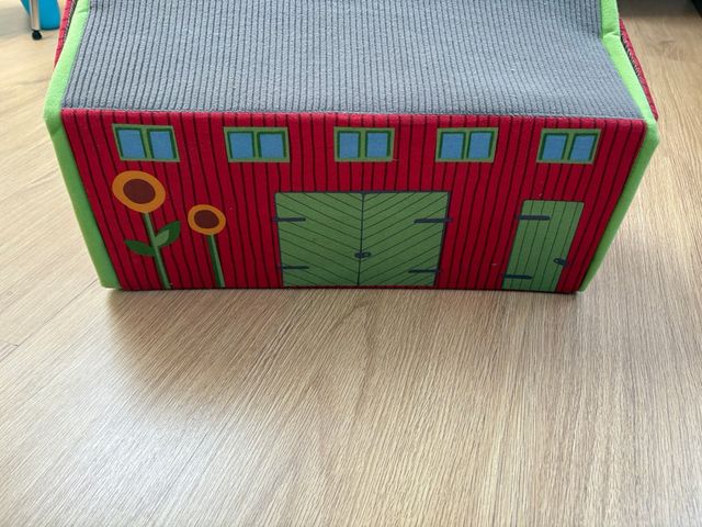 Bonita granja de juguete con diseño colorido. - Techo gris a rayas. - Paredes rojas con puertas y ventanas verdes. - Decoración de girasoles en el exterior.