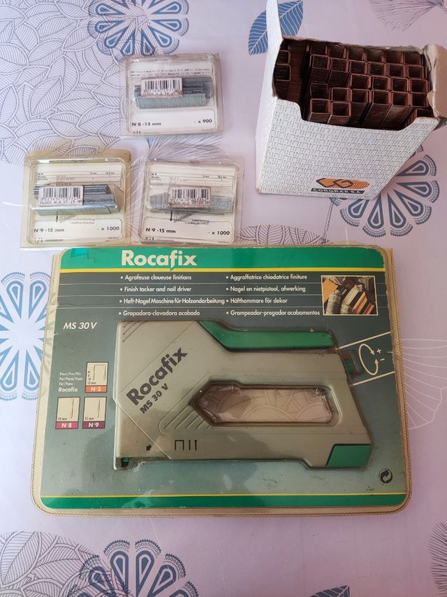 Detalles del productoGrapadora clavadora manual Rocafix MS 30V usada, en buen estado. La usé para poner unas molduras en unas puertas y después muy esporádicamente en alguna otra ocasión. Mango plegable en la máquina. Para clavos pequeños y grapas(ver fotos). Incluyo todos los clavos que tengo y una caja grande de grapas, para tapizados, etc.