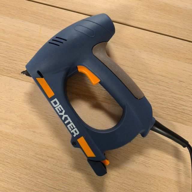 Grapadora eléctrica de la marca Dexter, ideal para trabajos de bricolaje y manualidades.