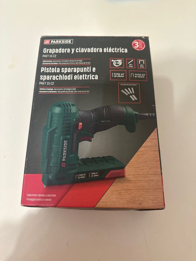 Detalles del productoGrapadora y clavadora eléctrica Parkside, modelo PHET 15 C2. Ideal para trabajos de decoración, bricolaje y reparaciones en el hogar.
