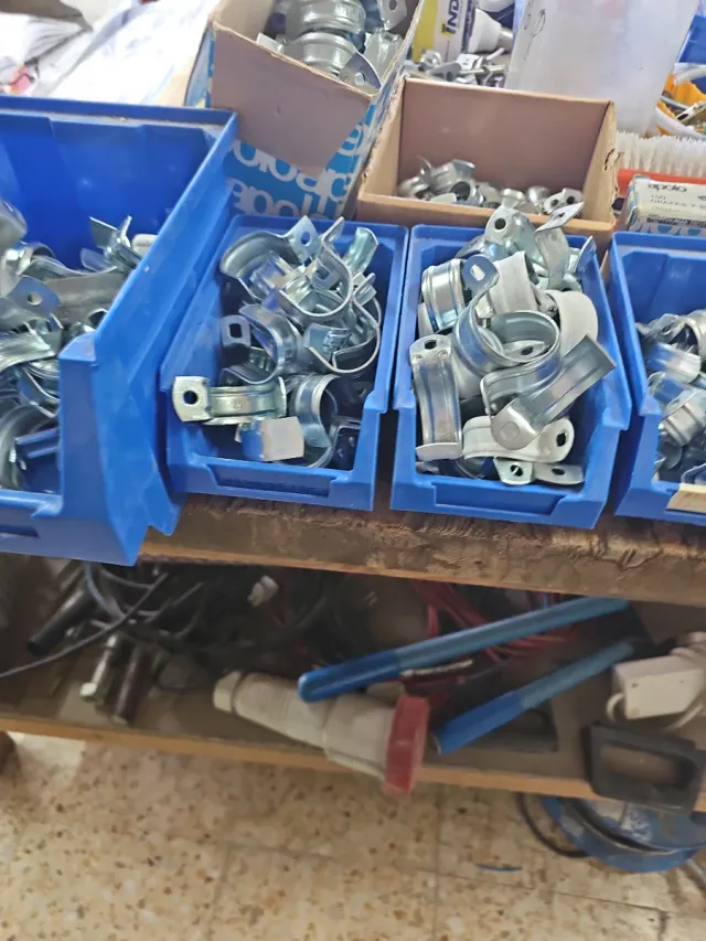 Lote de grapas metálicas de diferentes tamaños. - Material: Metal. - Uso: Sujeción de tuberías o cables.