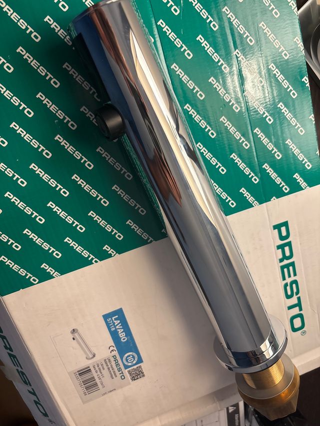 Grifería de lavabo Presto modelo 57118. - Diseño moderno y elegante. - Acabado cromado brillante. - con detector de manos. - 1,9 l/min. - Pila de 6V