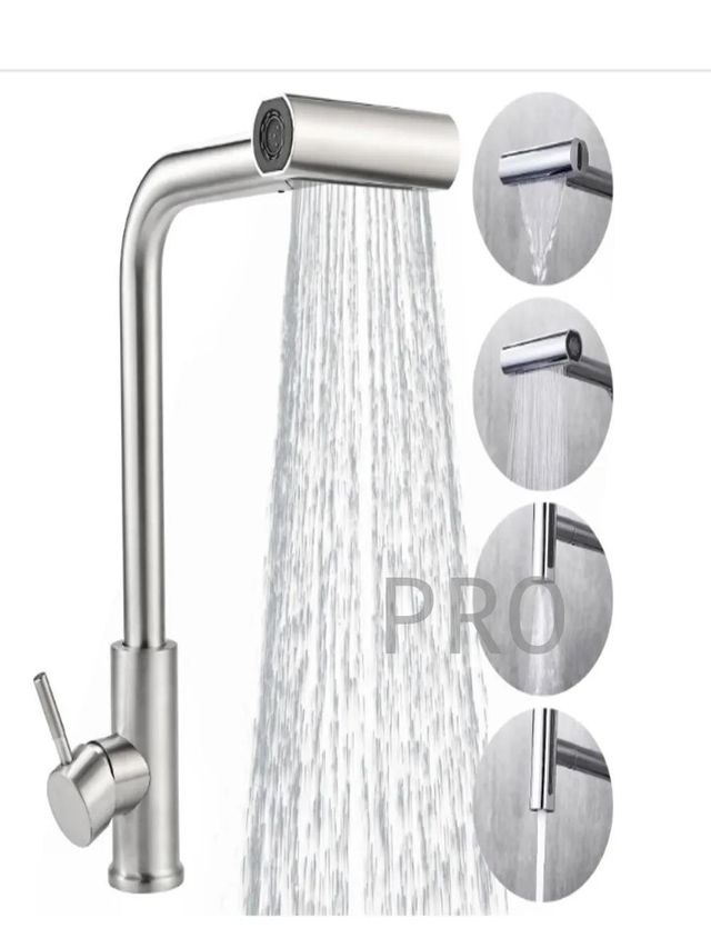 Detalles del productoGrifo abatible con 4 modos automáticos de agua, caño giratorio 360° y manguera extensible hasta 50 cm. Funcionalidad y estilo en tu cocina.