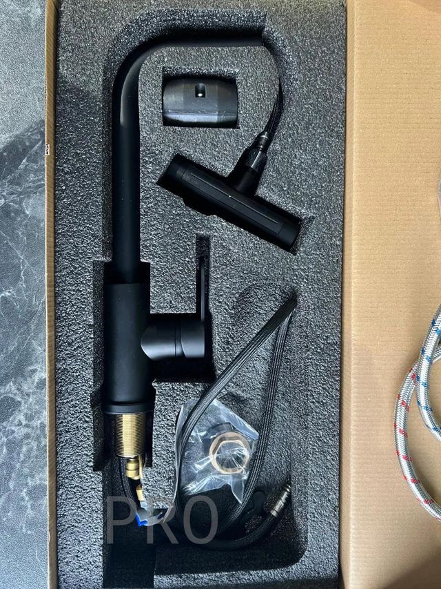 Detalles del productoGrifo de cocina negro con caño extraíble y 4 modos de salida: ahorro, presión, antisalpicaduras y cascada. Giro 360°, moderno y funcional.