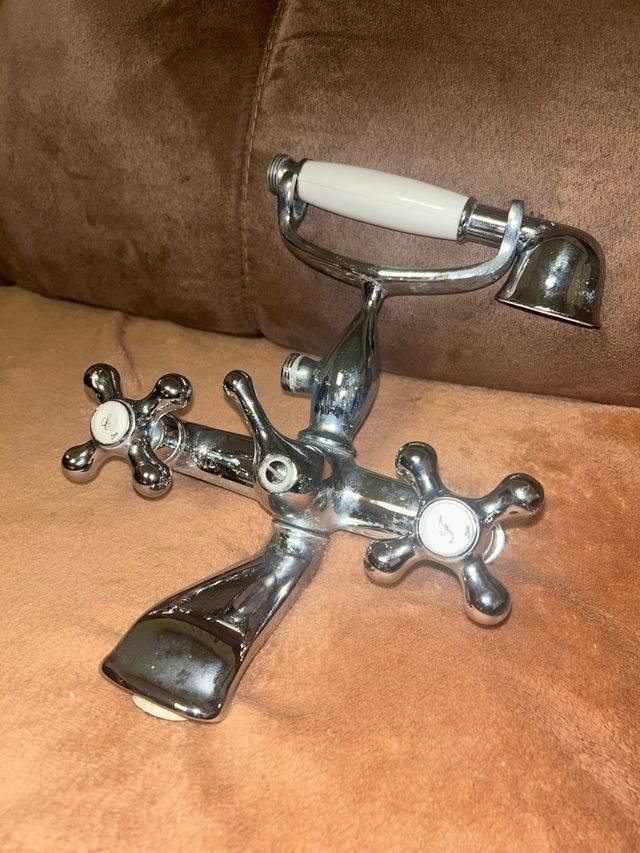 Grifo de latón antiguo, perfectamente funcional. - Diseño clásico con mandos de cruz. - Acabado cromado brillante. - Incluye teleducha con soporte.