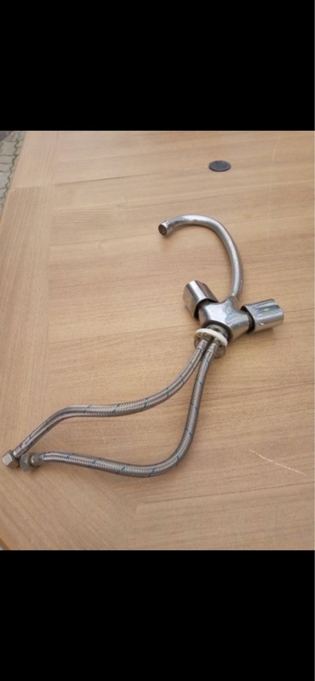 Grifo monomando para cocina, en buen estado. Incluye dos flexibles de conexión. - Diseño curvado elegante. - Acabado cromado brillante. - Incluye dos mangueras flexibles.