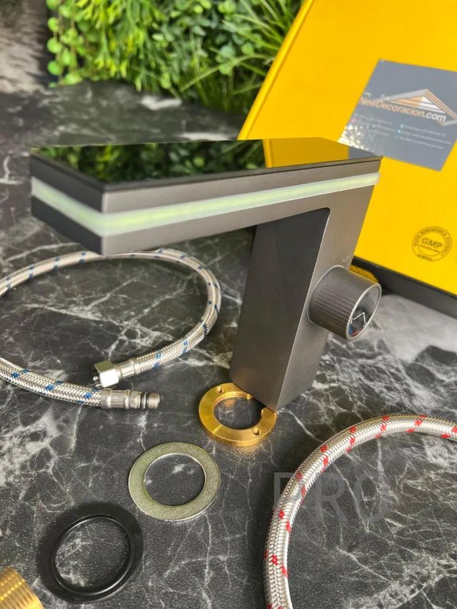 Detalles del productoGrifo inteligente para lavabo con pantalla LED, control de temperatura y diseño moderno en gris metálico. Incluye mangueras y accesorios.