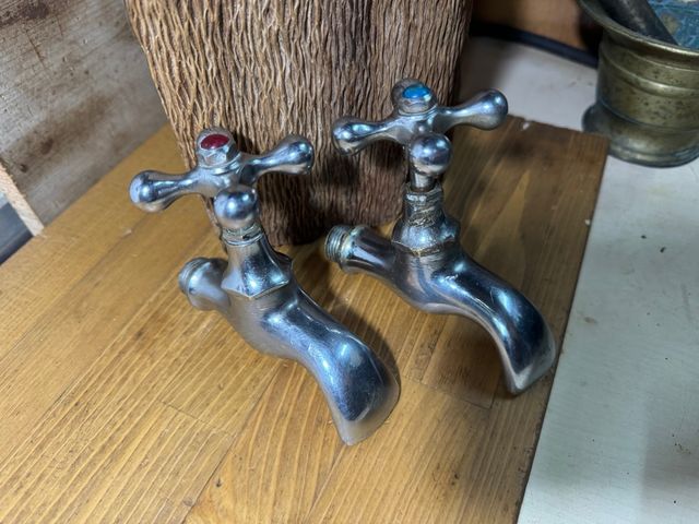 Detalles del productoPar de grifos antiguos de metal, con acabado cromado.