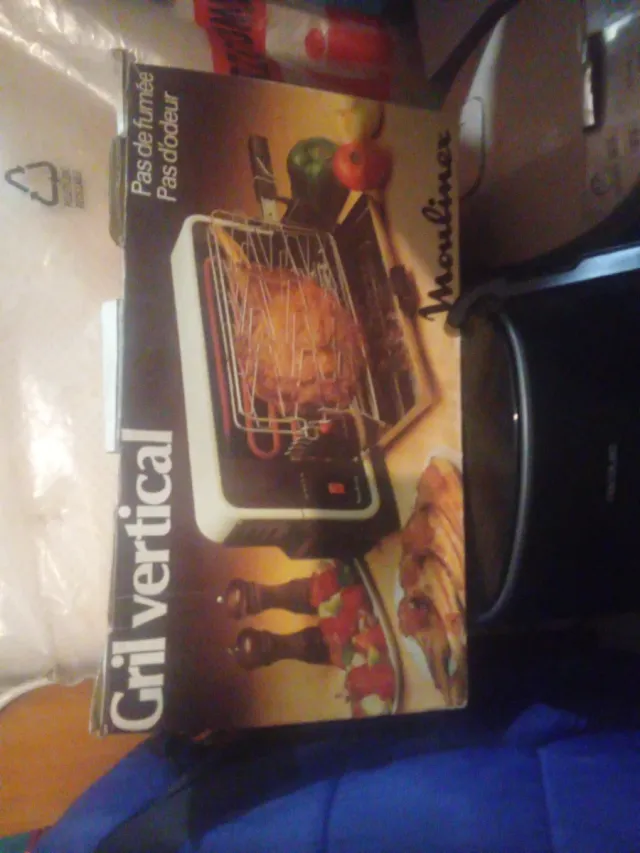 Gril vertical de la marca Moulinex. - Diseño compacto y funcional. - Ideal para asar alimentos de forma vertical.
