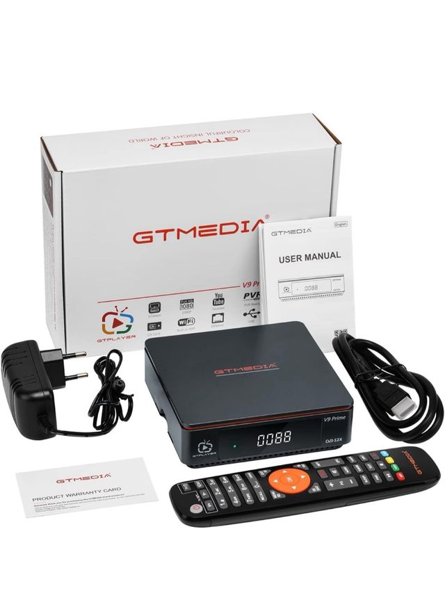 Detalles del productoReceptor GTMEDIA V9 Prime en color negro. Incluye mando a distancia, manual de usuario, cable HDMI, adaptador de corriente y tarjeta de red.