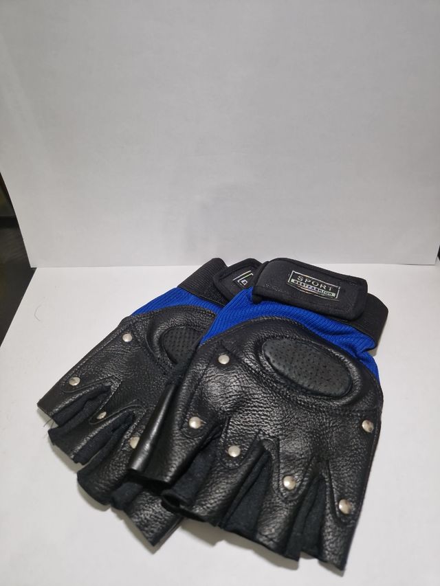 Guantes medio dedo azules. Completamente nuevos sin usar (literalmente el únicouso que le di fue para la foto). Son cómodos.
