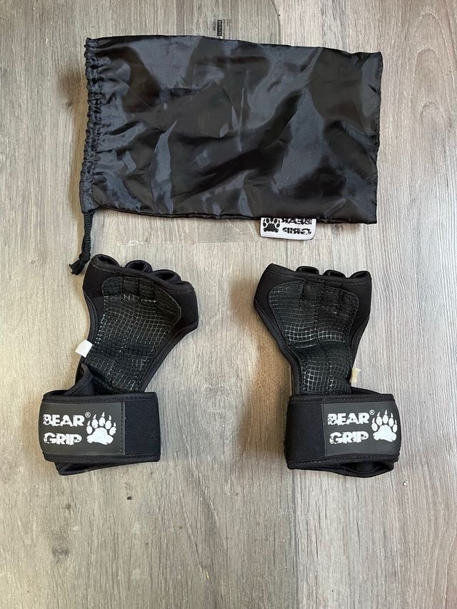 Detalles del productoPar de guantes para levantamiento de peso marca Bear Grip. Incluyen bolsa de transporte.