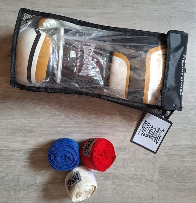 Detalles del productoGuantes de boxeo Fighter Choice de 12 onzas SIN ESTRENAR, en su embalaje original. Incluyen tres vendas Everlast (azul, roja y blanca). Son ideales para principiantes.