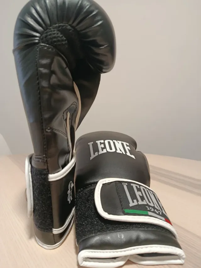 Guantes de boxeo de la marca Leone, en color negro. Han sido usados una sola vez. - Cierre de velcro. - Diseño ergonómico. - Logo de Leone 1947.