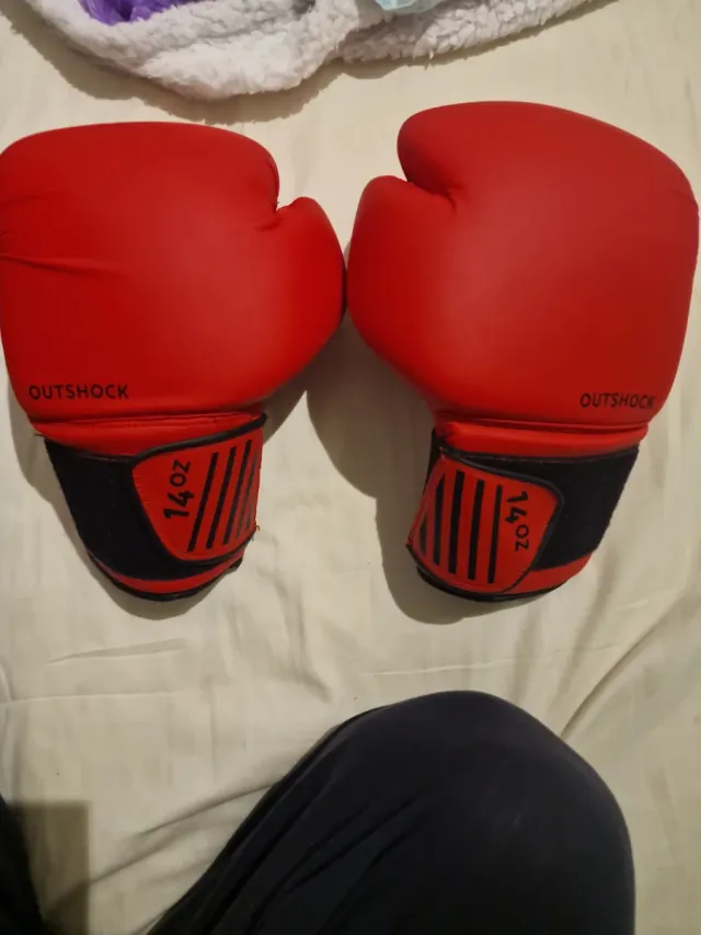 Par de guantes de boxeo de la marca Outshock en color rojo. - Cierre de velcro. - Diseño con rayas rojas y negras en la muñeca. - Indicación de peso de 14 Oz.