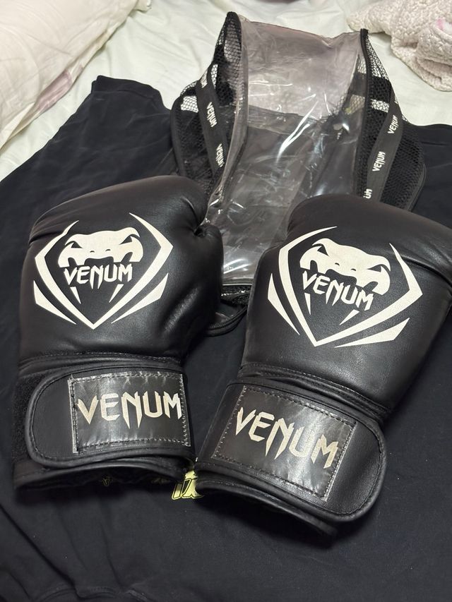 Detalles del productoPar de guantes de boxeo de la marca Venum en color negro. Incluyen una bolsa de malla para guardarlos.