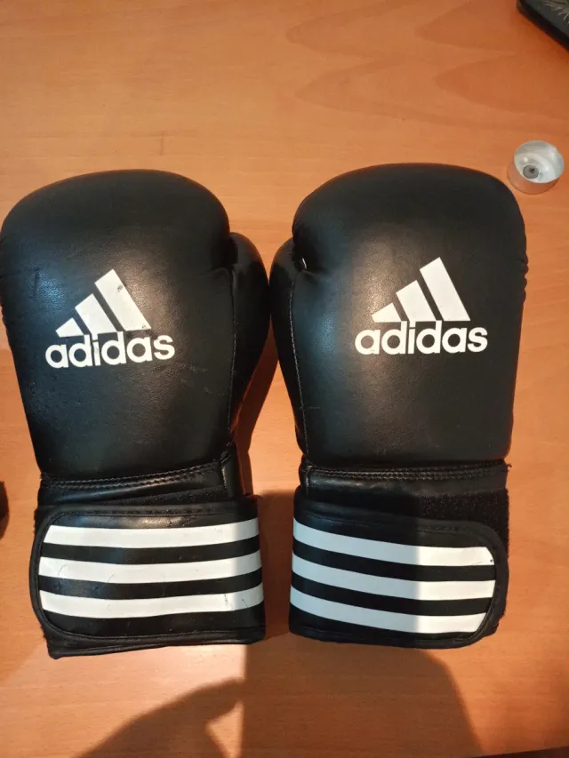 Par de guantes de boxeo de la marca Adidas en color negro. - Diseño con el logo de Adidas en blanco. - Tiras blancas en la muñeca.