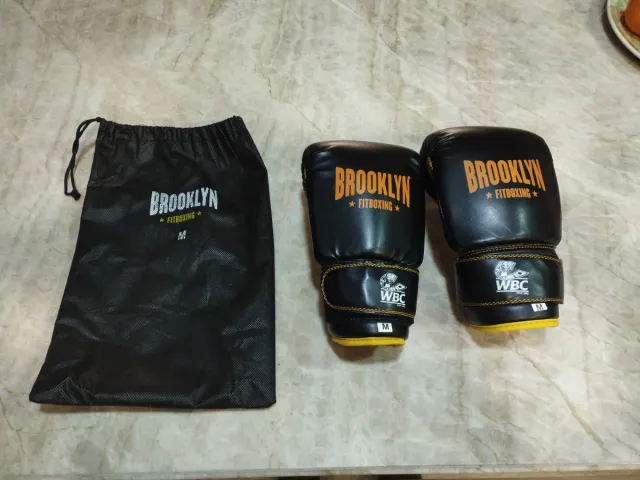 Par de guantes de boxeo de la marca Brooklyn, con licencia WBC. - Color negro. - Talla M. - Incluye bolsa de transporte negra con cordón.