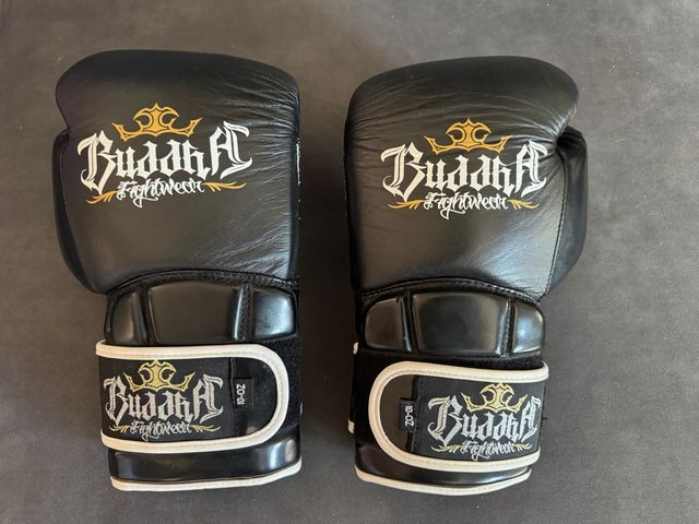 Guantes de boxeo de la marca Buddha en perfecto estado. Se han utilizado muy poco y fueron bien cuidados. - Color negro. - Cierre de velcro. - Talla 10 oz.