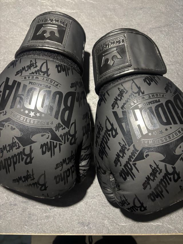 Par de guantes de boxeo, Muay Thai y K1 de la marca Buddha 12oz. - Color negro con estampado. - Cierre de velcro. - Diseño profesional.