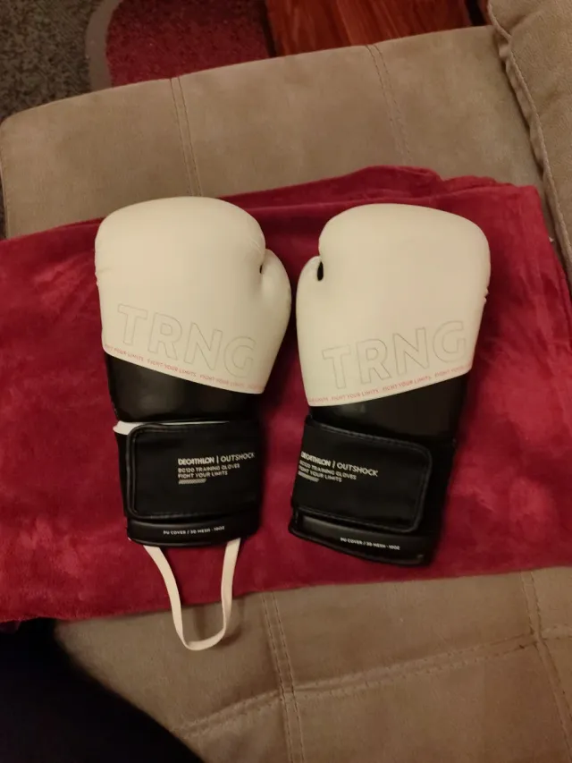 Guantes de boxeo Decathlon Outshock de 10 onzas. - Color blanco y negro. - Cierre de velcro. - Diseño TRNG.