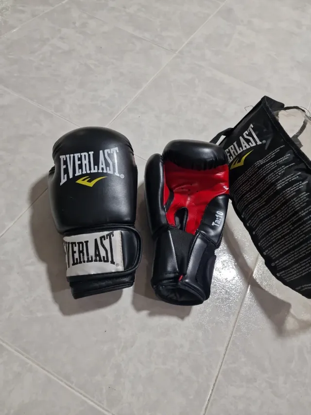 Par de guantes de boxeo de la marca Everlast. - Color negro con detalles en rojo. - Cierre de velcro. - Talla 10 oz.
