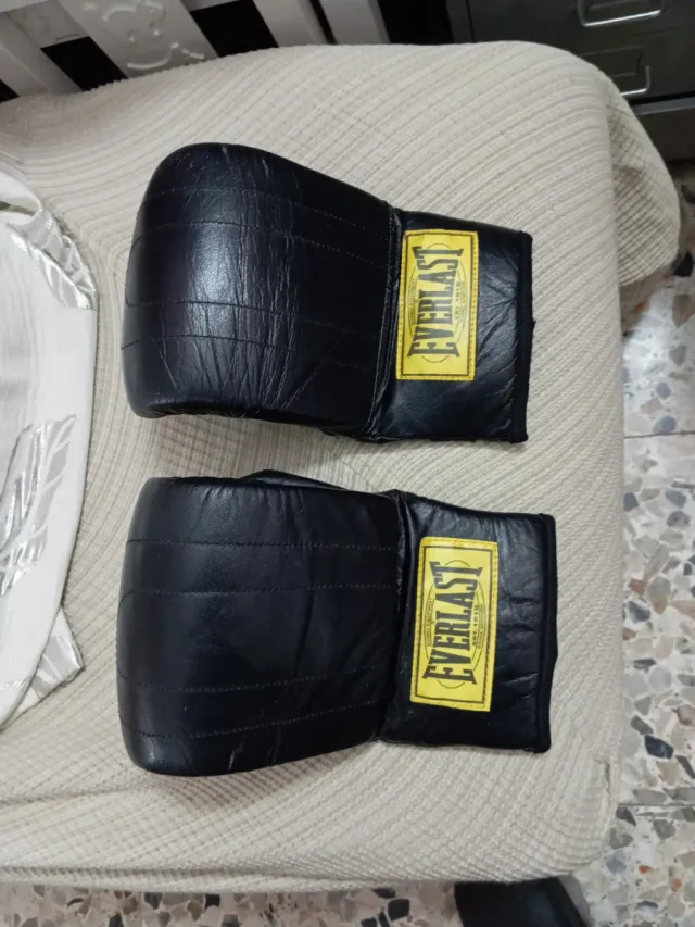 Par de guantes de boxeo de la marca Everlast. Un dedo de corto para rascarse . - Color negro. - Diseño clásico con etiqueta amarilla. - Material de cuero.
