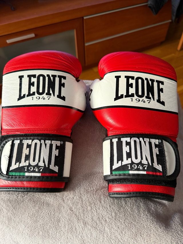 Par de guantes de boxeo de la marca Leone 1947. - Color rojo con detalles blancos y negros. - Cierre de velcro. - Diseño con el logo de Leone 1947.