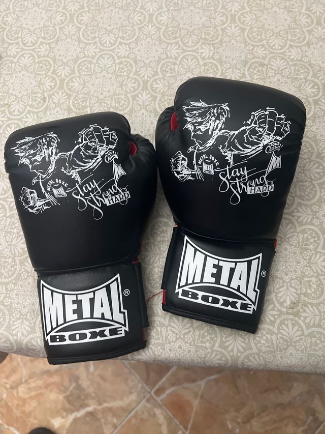 Par de guantes de boxeo de la marca Metal Boxe. - Color negro. - Diseño con ilustración y texto Stay Strong HARD. - Logo de Metal Boxe en la muñeca.